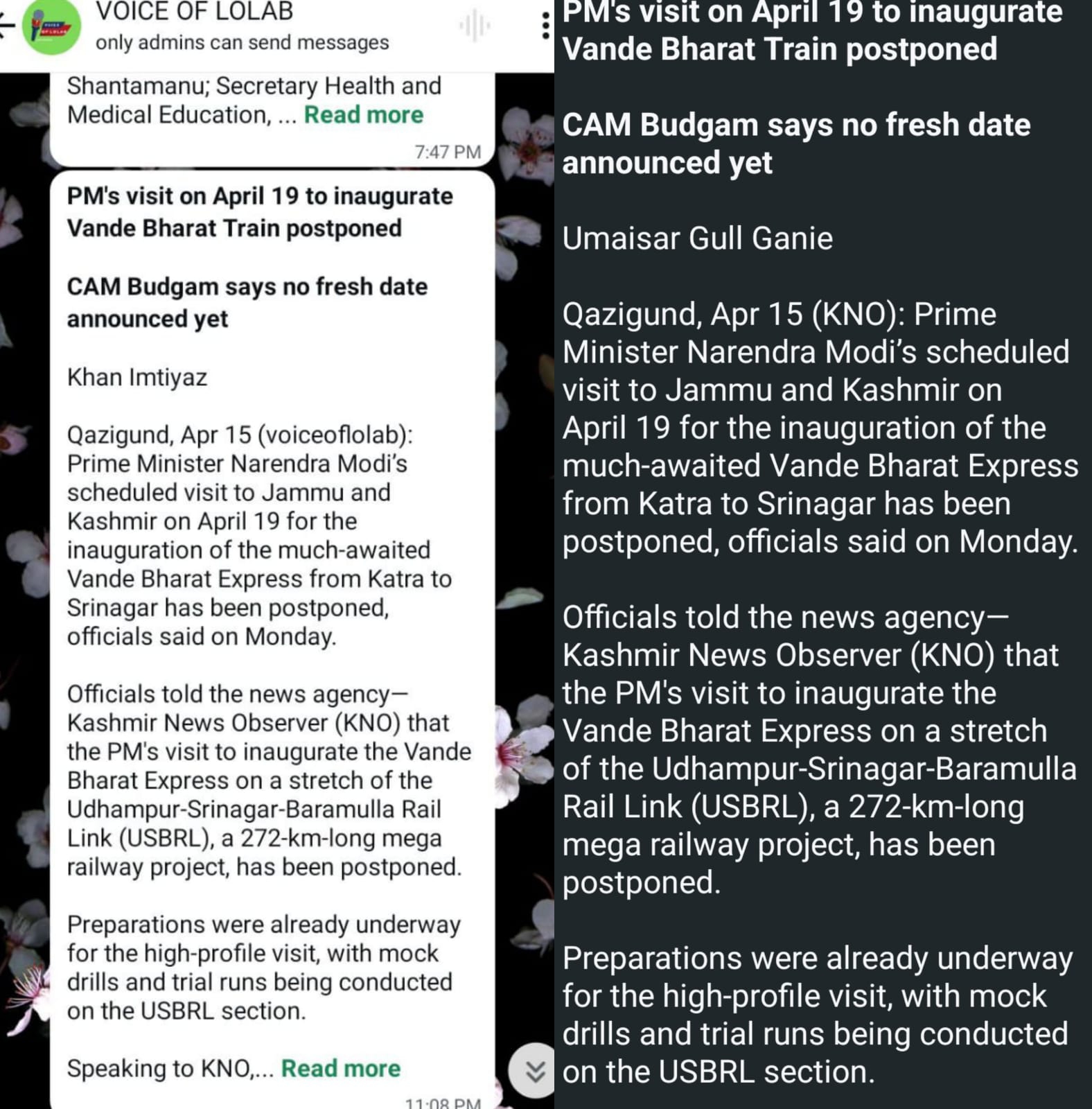 The original report, written by Umaisar Gull Ganie for the Kashmir News Observer (KNO), detailed the postponement of Prime Minister Narendra Modi’s scheduled visit to Jammu and Kashmir for the inauguration of the Vande Bharat Express on April 19. Khan, however, reproduced the story word-for-word, replaced the reporter’s name with his own, and attributed the report to his page Voice of Lolab.